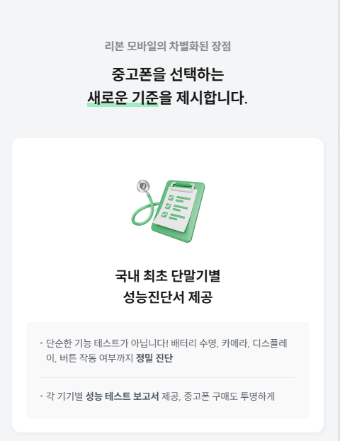 리본모바일이 가지고 있는 강점은 크게 다섯 가지로 정리할 수 있는데요, 첫 번째 장점은 바로 단말기별 성능 진단서를 제공한다는 점입니다. 단순히 기능 테스트를 진행하고 진단서를 발급하는 게 아니라 배터리 수명부터 카메라, 디스플레이, 버튼 작동등 기기 사용 시 꼼꼼하게 따져봐야 하는 부분들을 정밀하게 진단하고 그에 따른 세부 테스트 보고서가 제공됩니다.