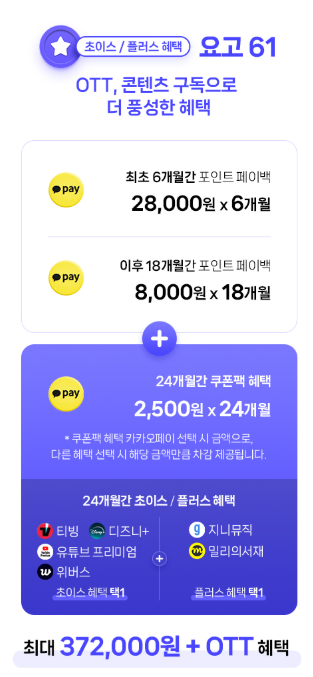KT 요고 요금제 중에서도 가장 인기 있는 요금제는 바로 요고 61입니다. 가입 시 첫 6개월간 매월 28,000원을 지원하고 이후 18개월간 매월 8,000원 그리고 카카오페이 쿠폰팩 선택 시 추가 8,000원 포인트가 지급되어 총 최대 504,000원 혜택을 받을 수 있습니다. 무엇보다 실질 체감 요금은 월 25,000원 수준으로 VIP 멤버십, 스마트기기 요금 100% 할인 혜택도 함께 제공됩니다.