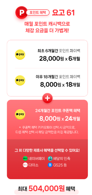 USIM/eSIM 개통 고객 기간 한정 혜택 페이백 이벤트도 놓칠 수 없겠지요? 요고 61 요금제의 경우 최대 504,000원에 해당하는 포인트 혜택이 주어집니다. 만약 쿠폰팩을 선택할 경우 네이버페이, 배달의 민족, 다이소, GS25 등 다양한 제휴사 선택 할 수 있어 내게 꼭 맞는 혜택을 받을 수 있는 장점을 가지고 있습니다. 요고 40 요금제에 주어지는 혜택도 풍성하고 말이죠.