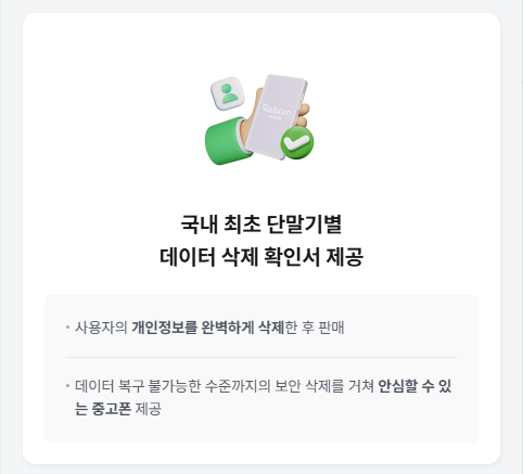 중고휴대폰을 구매할 때 기기 컨디션 만큼 신경 쓰이는 부분 바로 데이터입니다. 리본모바일에서는 국내 최초 단말기별 데이터 삭제 확인서를 제공하는데요, 사용자의 개인정보를 복구 불가능한 수준까지의 보안 삭제로 진행하여 완벽하게 삭제한 후 판매하기 때문에 안심할 수 있습니다.