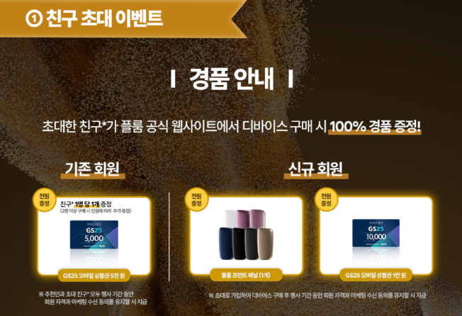신규회원의 경우 초대한 친구의 추천인 코드를 입력해 회원가입을 완료한 후 행사 기간 동안 회원 자격과 마케팅 수신 동의 유지를 필수로 진행하고 플룸 디바이스를 구매하면 100% 선물이 지급됩니다. 여기에 나만이 추천인 코드를 발급받아 또 다른 친구를 초대하면 추가 경품 기회까지 얻을 수 있습니다.